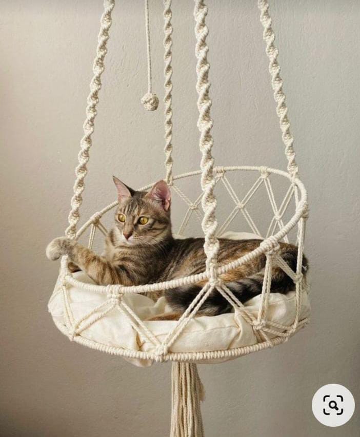 Camas colgantes en macrame, con cojin para mejor acomodo del gato o mascota pequeña. Colores a escoger.