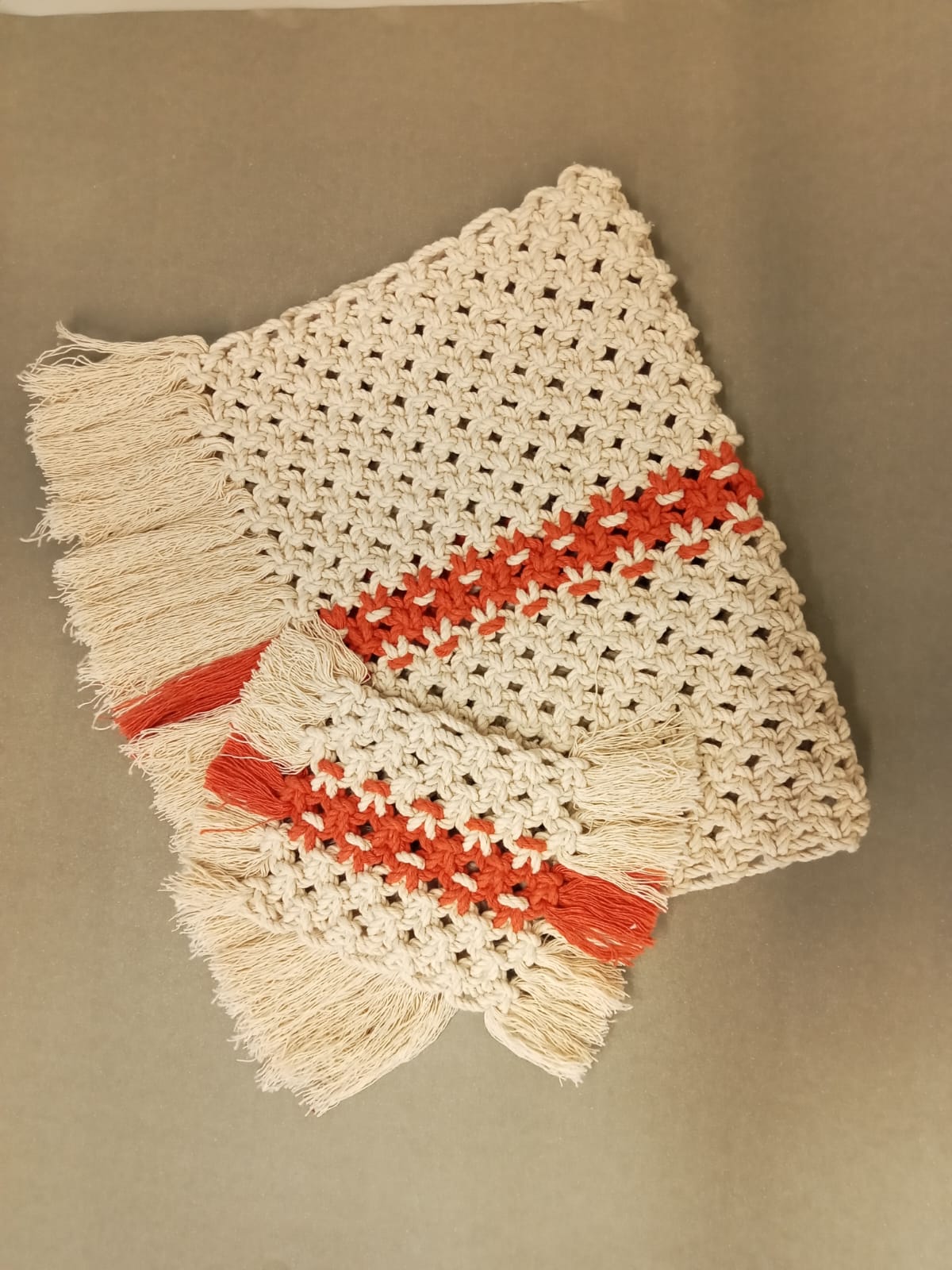 Set de 4 individuales y 4 portavasos, combinacion tonos calidos. Tamaño: Indv. 45ctm. x 25ctm. porta vaso: 15ctm x 8ctm.